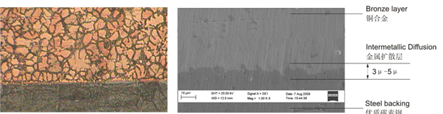 It can be seen from the metallographic diagram that there is mutual diffusion between the steel and copper alloy in the critical region, and the diffusion layer generated in the casting process is about 3μ-5μbetween the two materials to achieve complete metallurgical bonding and form a good bonding strength, which in any case exceeds the mechanical strength of the copper alloy itself.